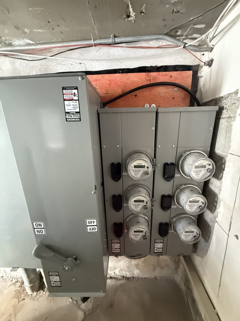 The project included a full replacement of the existing meter setup with a modern, code‑compliant multi‑meter bank designed for long‑term reliability and accurate tenant billing.