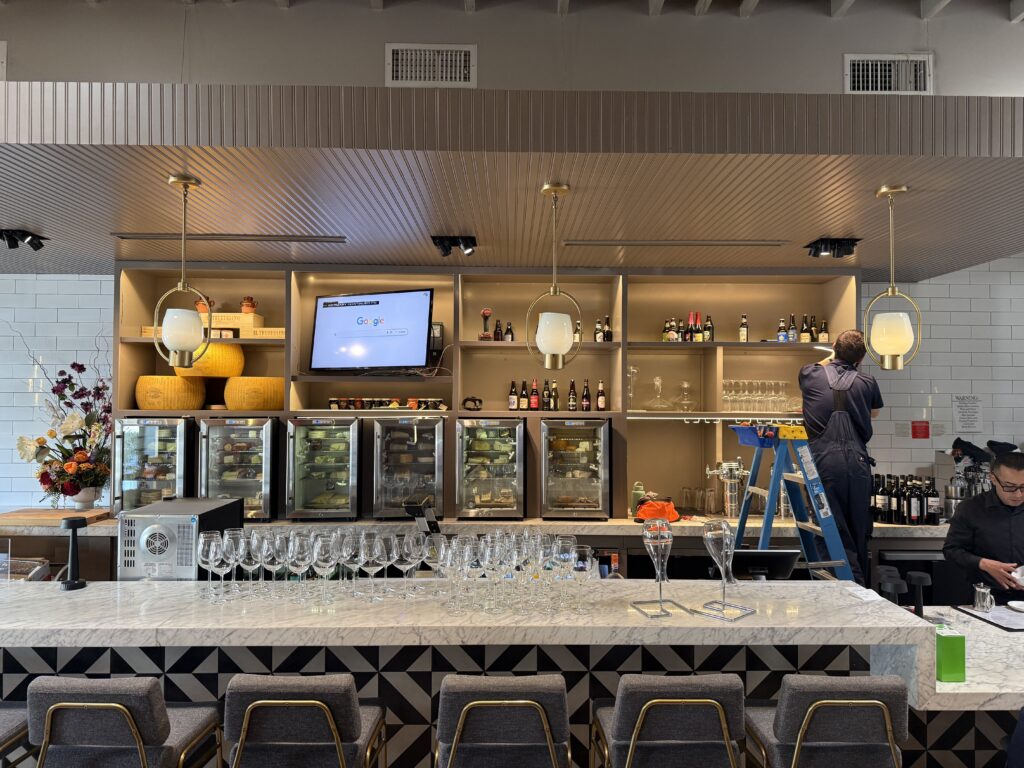 A well-designed lighting system does more than illuminate—it creates mood, highlights architectural features, and enhances customer experience. In this Santa Monica restaurant, outdated fixtures were replaced with energy-efficient lighting, and shelves were fitted with warm LED strips that now glow with character.